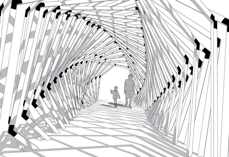 The Geometer is an urban intervention directly on the Atlanta Beltline which promotes both physical and visual relationships as through conditions for users of the corridor and as a visual link, or stitch, between the Beltline and the adjacent neighborhoods of Ansley Park and Ansley Mall. The structure transforms the humblest of materials, stud grade 2x4s, into an intricately woven self-supporting lattice-work through the use of parametric modeling and 5-Axis CNC technology. The multi-order twisting hexagonal geometry modulates light and view for users while creating a visual landmark on the Beltline from key points in the environment.
