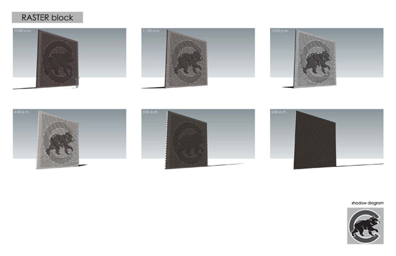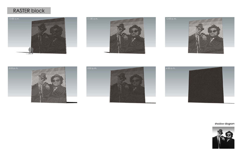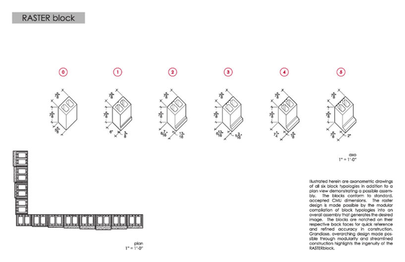 Illustrated herein are axonometric drawings of all six block typologies in addition to a plan view demonstrating a possible assembly. The blocks conform to standard, accepted CMU dimensions. The raster design is made possible by the modular compilation of block typologies into an overall assembly that generates the desired image. The blocks are notched on their respective back faces for quick reference and refined accuracy in construction.