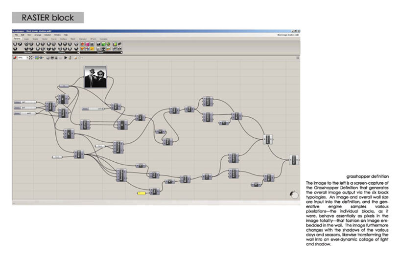 This image is a screen-capture of the grasshopper definition that generates the overall image output via the six block typologies. An image and overall wall size are input into the definition, and the generative engine samples various pixelations - the individual blocks behave essentially as pixels in the image totality - that fashion an image embedded in the wall. The image furthermore changes with the shadows of the various days and seasons, likewise transforming the wall into an ever-dynamic collage of light and shadow.